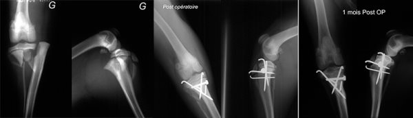 Fracture complexe. Salter 2 de l'épiphyse proximale du tibia avec arrachement tubérositaire chez un chiot de 5 mois, traitée par broches et vissage interfragmentaire. Intervention à foyer ouvert ménagé sous contrôle fluoroscopique.