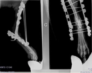 Fixateurs externes. Historiquement, les fixateurs externes sont une des premières techniques de traitement chirurgical des fractures à avoir été utilisés (Lambotte 1902). C'est une technique, aux champs d'application quasi-universels, est actuellement, en chirurgie vétérinaire, principalement réservée aux de traitements des fractures ouvertes, des infections osseuses et de toutes les indications pour lesquelles les méthodes de fixation interne ne sont pas utilisables : le suivi post opératoire laborieux fait qu'on limite cette technique aux indications pour lesquelles elles demeurent incontournables. La possibilité de mise en place à foyer fermé est un de leur principal atout, l'utilisation d'un amplificateur de brillance est dans ce domaine incontournable. La clinique est équipée d'un amplificateur de brillance numérique de dernière génération qui permet le recours à cette technique dans les conditions optimales pour le patient.